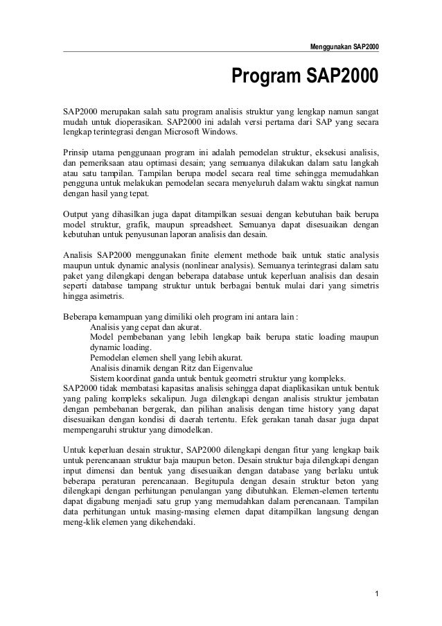 Book.Author:Kajizragore KazrakazahnCountry:Czech RepublicLanguage:English (Spanish)Genre:RelationshipPublished (Last):12 March 2008Pages:305PDF File Size:19.37 MbePub File Size:10.15 MbISBN:629-5-63161-150-8Downloads:67340Price:Free.Free Regsitration RequiredUploader:Belajar Sap Pdf Download – quizkleverFitur perpustakaan yang komprehensif dari bagian baja dan propertinya. In particular, genetic algorithms GA are used to derive friction coefficient and radius of curvature values that optimize the performance of SFPB isolators applied in the base of tanks of both squat and slender geometry.With conventional PoA, the torsional effects are mostly pronounced in the elastic range and early stages of plastic behaviour and tend to decrease with an increase in the plastic deformations, thus failing to capture the effects of torsion in buildings. Ads help cover our server costs.Seismic evaluation of existing structures and of the proposed design for new structures can be done based on Non-linear Static Procedure popularly known as Pushover Analysis PoA. Structural dynamics is a module of structural analysis that encapsulates the behavior of structures subjected to dynamic loadings. Terjemahkan deskripsi ke dalam Indonesia menggunakan Google Terjemahan?